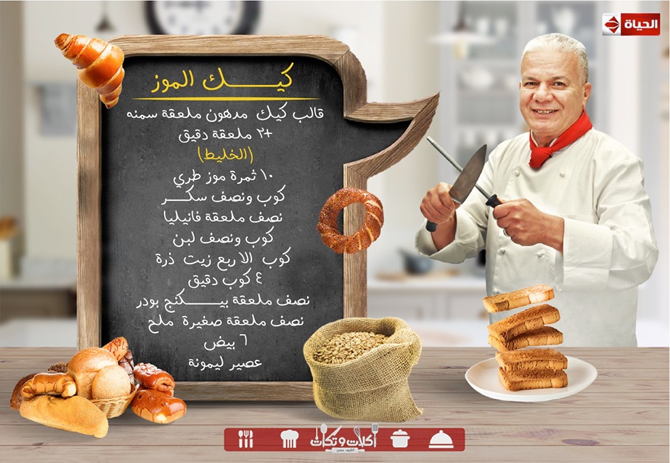 طريقه عمل كيك الموز بطريقه الشيف حسن من برنامج اكلات وتكات على قناه الحياة الشيف حسن